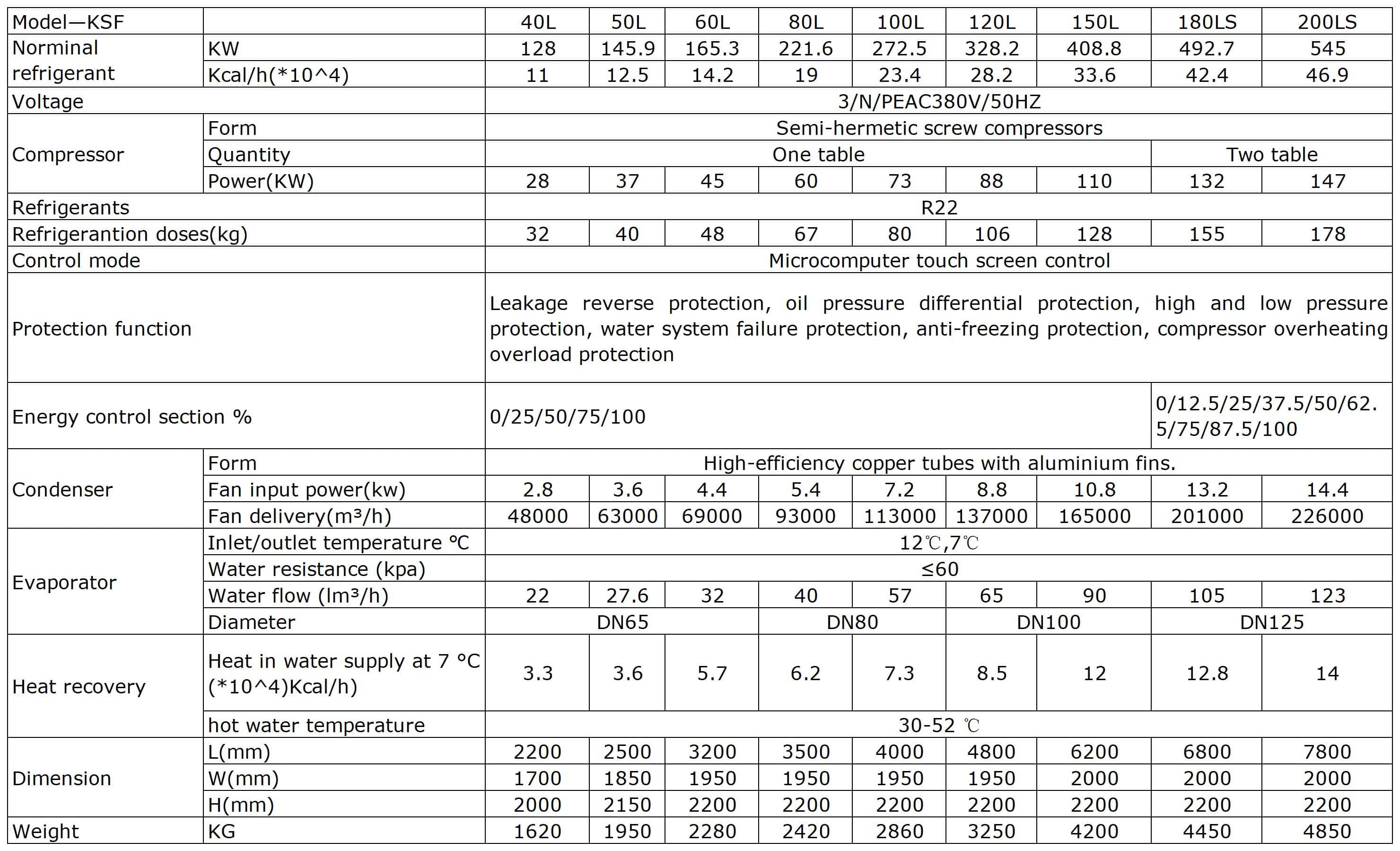 An air cooled scroll chiller is an air-cooled cooling equipment that consists of a hermetic scroll compressor, condenser, evaporator, electronic expansion valve, fan, and other components. The refrigeration copper piping of the KSF air-cooled scroll chiller adopts the hermetic manufacturing process, which reduces the copper soldering and leakage points; with the adoption of a hermetic scroll compressor, the compression efficiency is higher, which can provide stable and high-efficiency performance in a wider range of working conditions. The standard refrigeration capacity of the equipment ranges from 36 tons to 155 tons (128kw to 545kw), with high refrigeration capacity, which can provide large-scale cooling capacity for industrial manufacturing, building air conditioning, food processing, chemical process, medical equipment, electronic manufacturing, etc. In addition, Kassel can also provide you with customized products according to your requirements for refrigeration capacity.