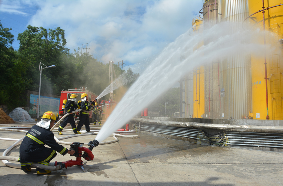 根據(jù)應(yīng)急預(yù)案響應(yīng),參演人員全力以赴,積極應(yīng)對(duì)險(xiǎn)情;公司消防隊(duì)迅速出動(dòng),專職消防人員從架設(shè)水槍開展專業(yè)撲救,到身穿防化服進(jìn)入泄漏點(diǎn)進(jìn)行檢測(cè)和堵漏;環(huán)保人員對(duì)事故現(xiàn)場(chǎng)周圍大氣環(huán)境和事故污水進(jìn)行了收集和有效監(jiān)測(cè),充分展示了有機(jī)分廠、保衛(wèi)處消防隊(duì)、生產(chǎn)安環(huán)部等相關(guān)單位的應(yīng)急處置能力,達(dá)到了練指揮、練技能、練協(xié)同、練戰(zhàn)法、練保障的效果。
